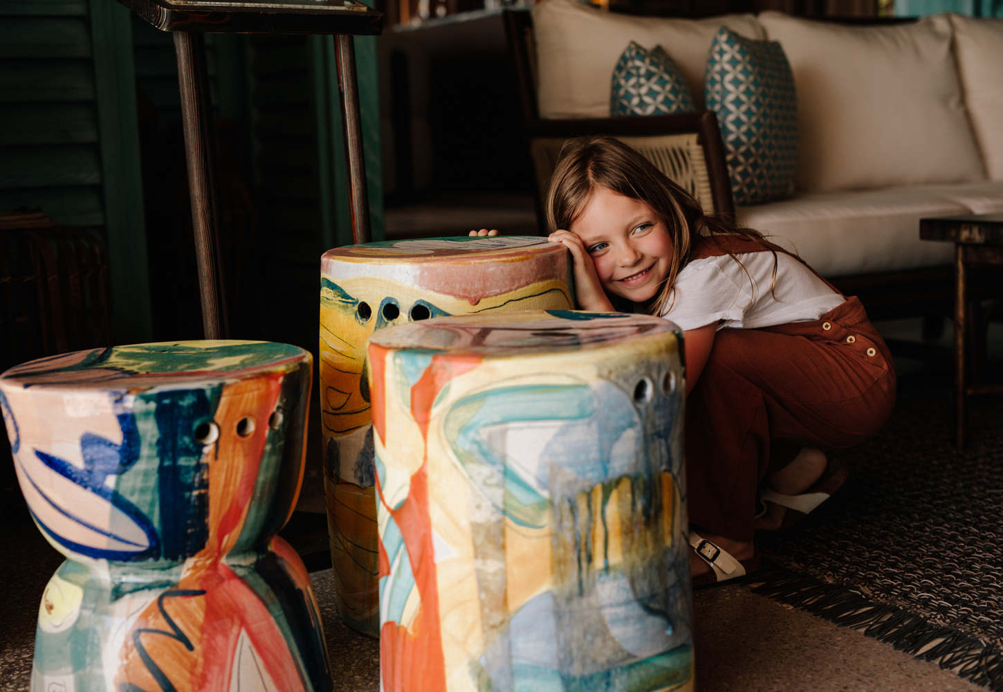 The vibrant stools are designed to last for many years, absorbing the warmth of the sun and the tales of the guests who enjoy sitting on them as time passes by. They are ready to befriend you and listen to your stories....what will you tell them?